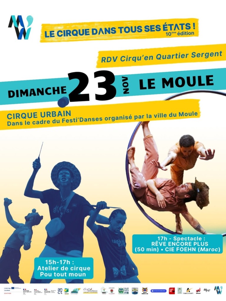 - Le 23 novembre, un rendez vous cirque aura lieu en quartier au Moule. La compagnie Foehn, venue du Maroc, jouera Une invitation au voyage au Parc Sergent.